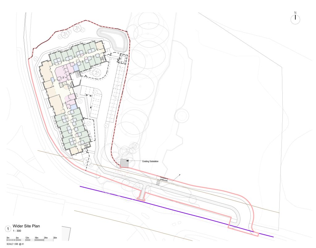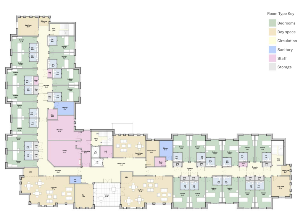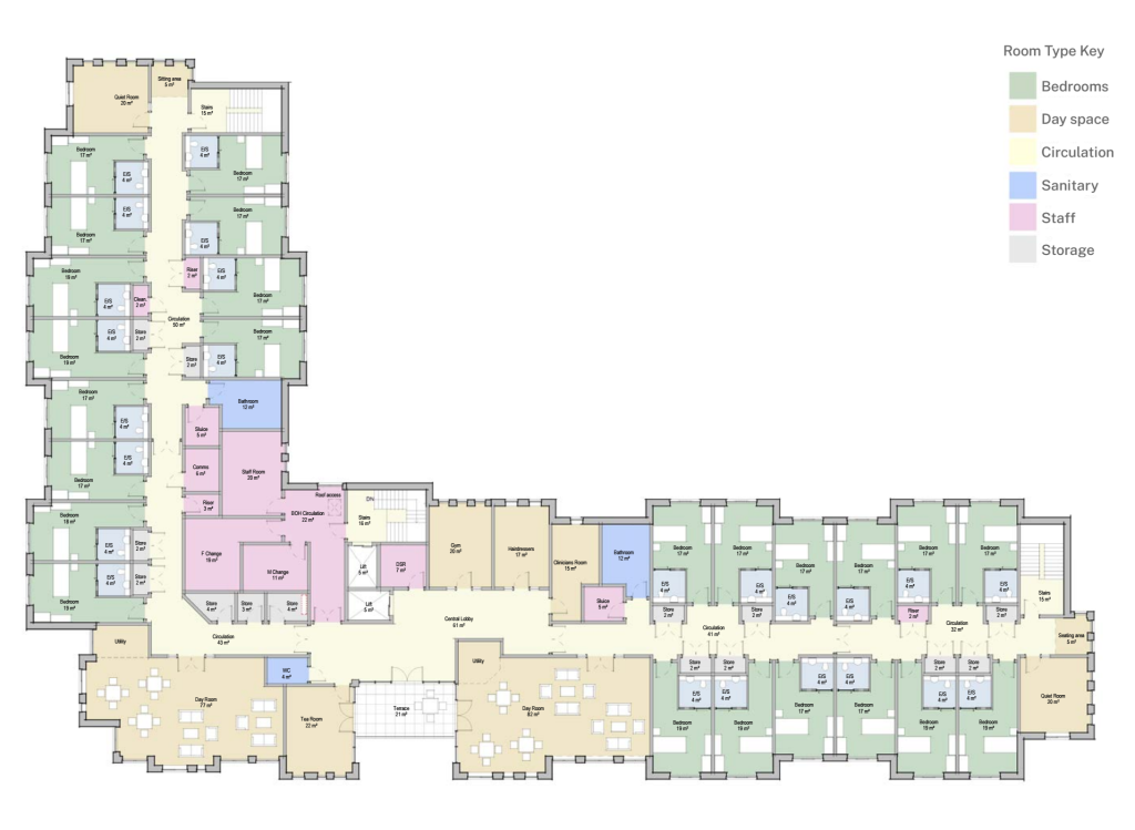 In this case the accommodation is split into six equal units, each containing 12 care bedrooms and living / dining facilities forming self contained care households.